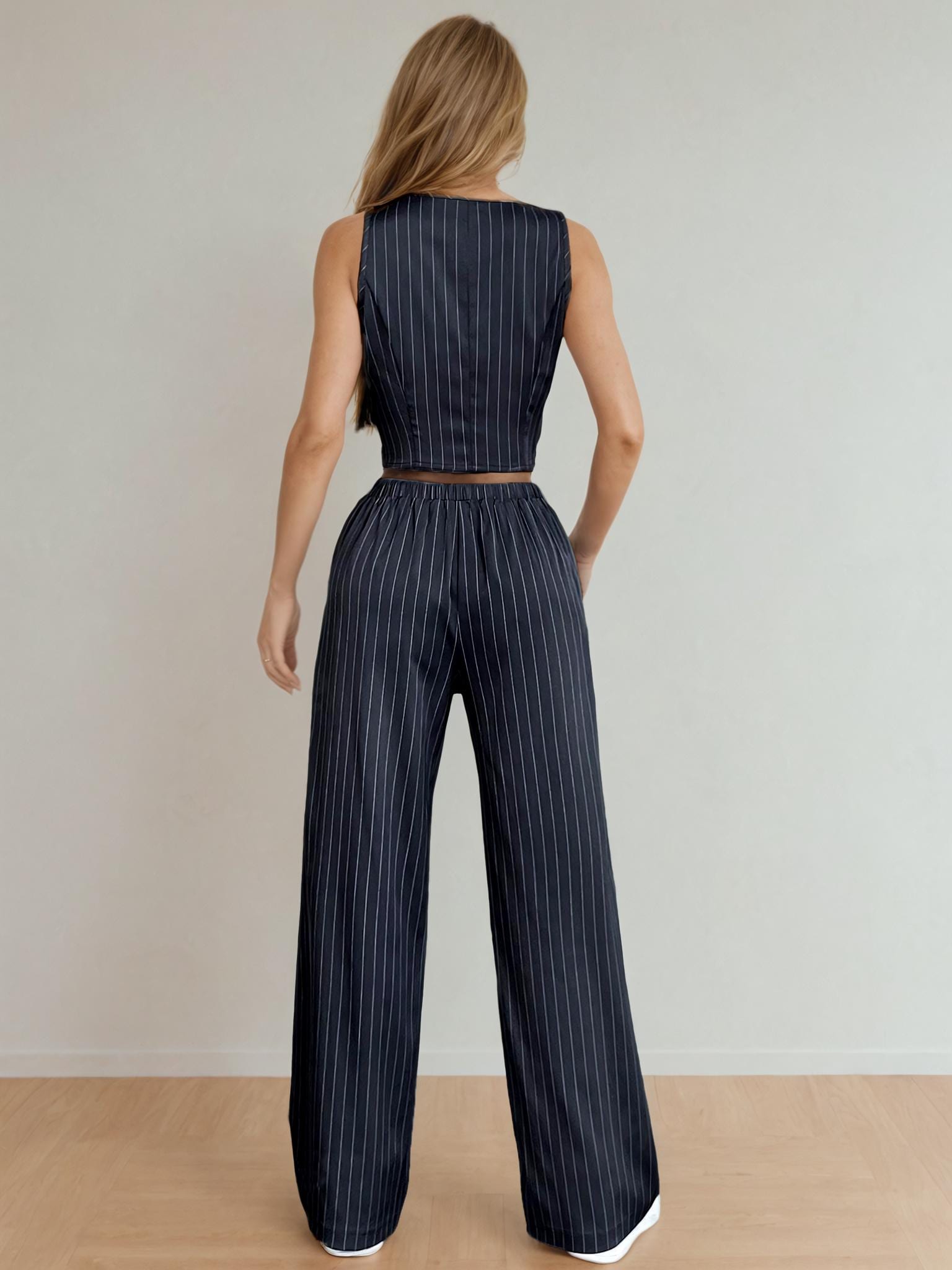 Create a coordinated vest and pants outfit with this sewing pattern set. Perfect for women aiming for a chic and tailored wardrobe staple
